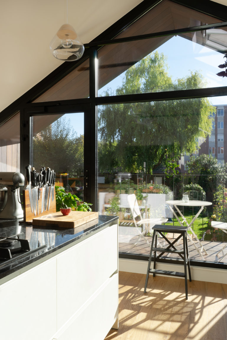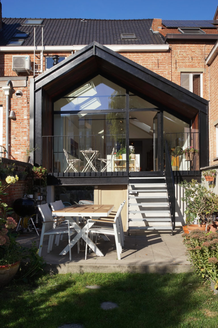 De bestaande bijbouw met te kleine keuken en toilet, blokkeert het zicht op de tuin vanuit de leefruimte. Deze uitbouw zal afgebroken worden en plaats maken voor een ruime nieuwe uitbreiding die de bestaande woning opnieuw verbind met de tuin.